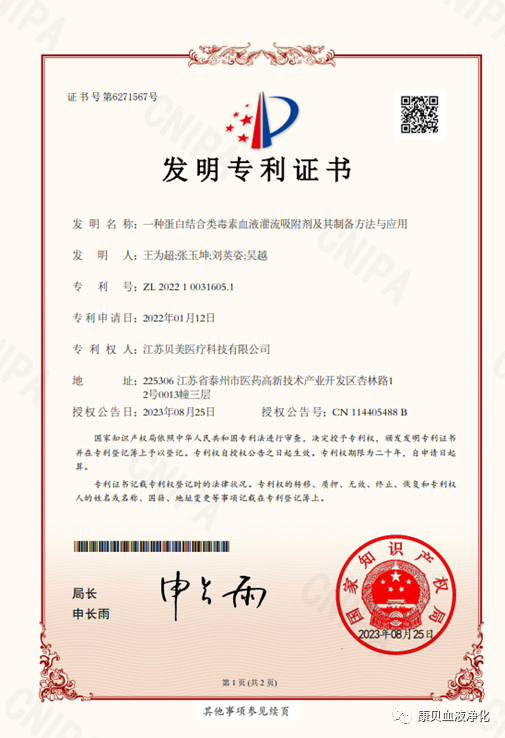 近日,康貝醫(yī)療下屬子公司江蘇貝美醫(yī)療科技有限公司開發(fā)申報(bào)的“一種蛋白結(jié)合類毒素血液灌流吸附劑及其制備方法與應(yīng)用”發(fā)明專利,正式獲得國(guó)家知識(shí)產(chǎn)權(quán)局授權(quán)。