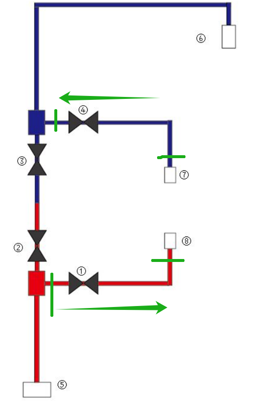 于是小編馬上跟護士長及臨床護士了解原因,在護士確定操作上機連接灌流器時已經進行了重力預沖排氣,肉眼觀察未見灌流器內有氣泡和空氣存在,排除因灌流器排氣不充分造成;觀察管路,未見有管路銜接不緊密情況;肝素泵管尾端密封帽也旋緊,注射其他藥物時已排氣,也排除這種可能;繼續詢問,護士反饋密閉式管路預沖排氣時,灌流器連接支路忘記預沖排氣了,因透析治療時沒有連接灌流器,所以將灌流支路夾①④一直處于關閉狀態(如下圖示意),這就導致聯合治療引血后密閉式管路支路里的空氣會再次進入到灌流器和透析器內,導致上圖現象發生,引發機器空氣報警。所以,在透析開始后使用密閉式管路連接灌流器模式進行治療時,切記在預沖透析器及管路時一并將連接灌流器支路的卡扣夾打開,待充滿鹽水后再將其關閉,密封帽⑦⑧旋緊待用。