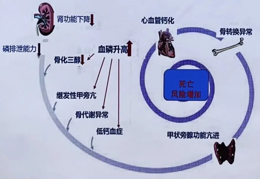 高磷血癥常伴隨低鈣血癥,刺激甲狀旁腺分泌過多的甲狀旁腺激素(PTH),導致繼發性甲狀旁腺功能亢進,進而引發骨痛、骨折等癥狀。