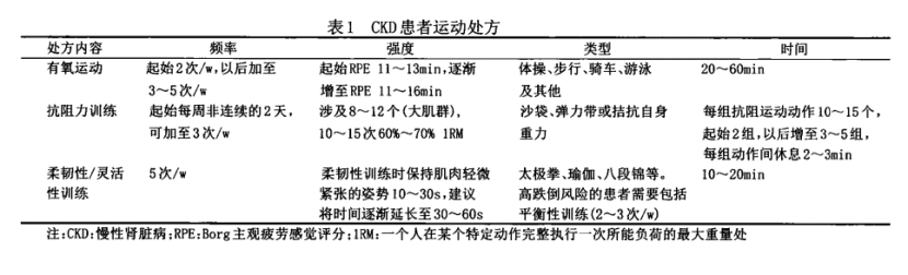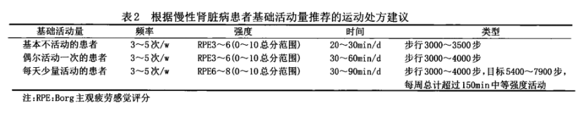 CKD患者的運動能力受損,身體機能水平低下,從而導致周期性的體力活動水平降低,最終功能失調。針對CKD患者的運動康復,國內專家共識基于運動頻率、強度、時間、類型的運動處方進行細化(見表1)并說明,若CKD患者運動能力明顯下降,運動康復的起始階段主要是提高體力活動,應根據患者目前的活動量制定體力活動目標(見表2)。