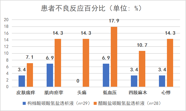 維持性血液透析時,對醋酸鹽不耐受的患者長期使用醋酸鹽透析液時易產生皮膚瘙癢、肌肉痙攣、低血壓、四肢麻木和心悸等不良反應。研究表明,使用枸櫞酸碳酸氫鹽透析液時,不良反應明顯低于前者。[6]