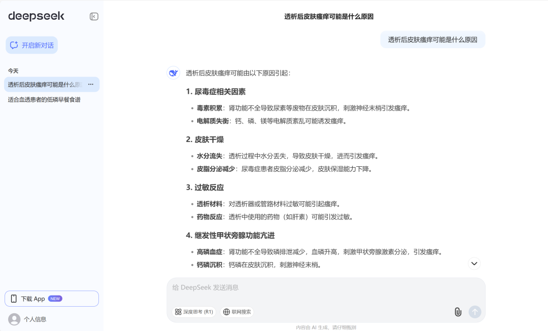 例如,輸入“透析后皮膚瘙癢可能是什么原因”,DeepSeek會(huì)列出可能的誘因,如高磷血癥、過敏反應(yīng)等。