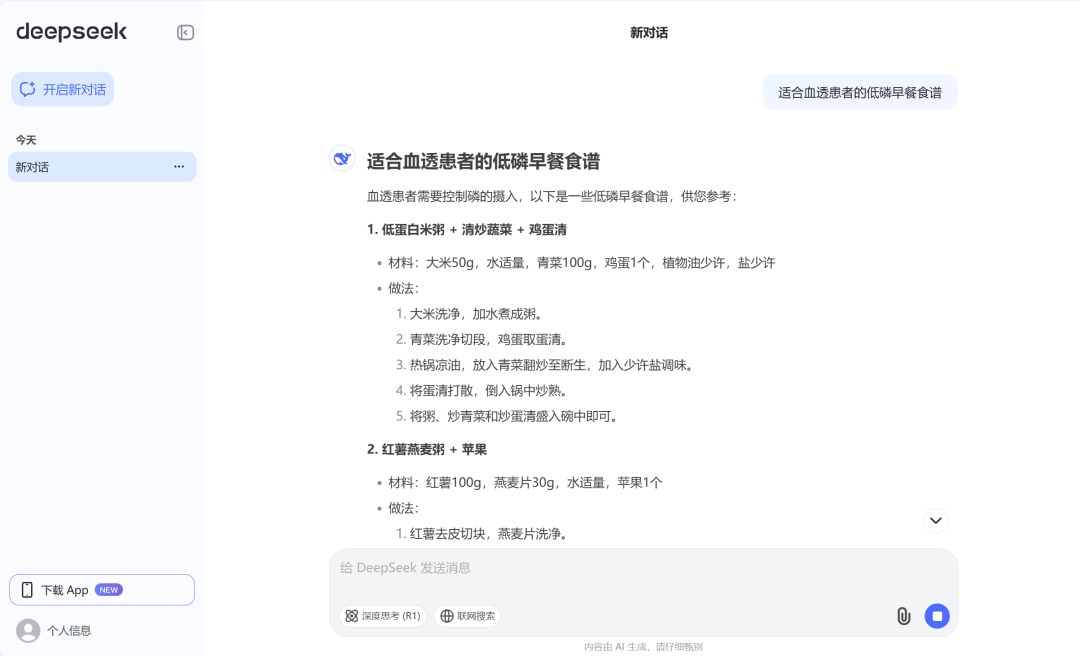 例如,輸入“適合血透患者的低磷早餐食譜”,DeepSeek會(huì)生成多種食譜供你參考。