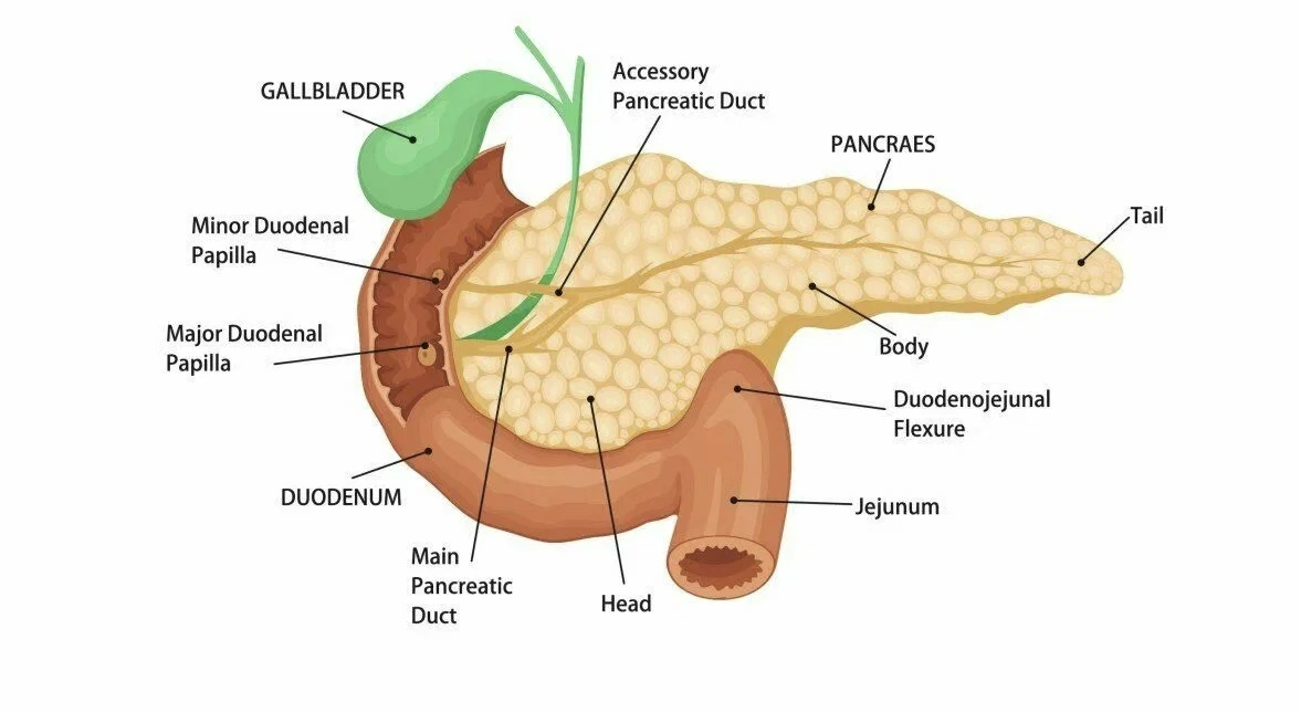 胰腺(Pancreas)是人體重要的消化和內(nèi)分泌器官。它是一個(gè)狹長(zhǎng)的腺體,深埋于上腹部,躲在胃的后面,平時(shí)X光平片是看不到胰腺的。胰腺具有外分泌和內(nèi)分泌的作用。一方面,胰腺分泌含有多種消化酶的胰液,比如胰淀粉酶、胰蛋白酶和脂肪酶,幫助分解碳水化合物、蛋白質(zhì)和脂肪,促進(jìn)營(yíng)養(yǎng)物質(zhì)的吸收。另一方面,胰腺中的胰島分泌胰島素和胰高血糖素,這些激素調(diào)節(jié)血糖水平,保持體內(nèi)血糖的平衡。