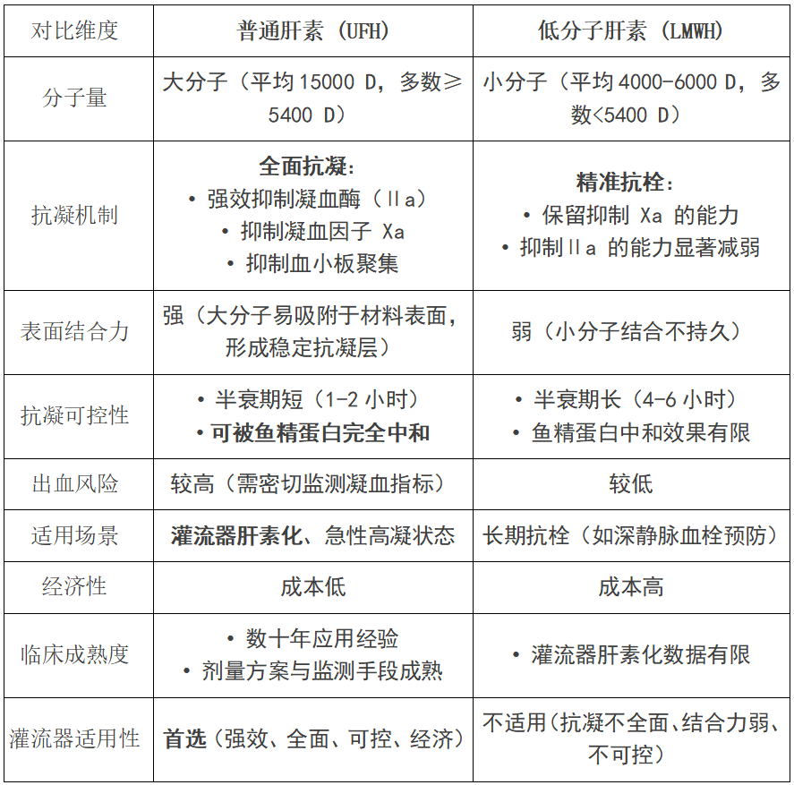 灌流器內(nèi)的凝血反應(yīng)是 “全鏈條激活”,既需要抑制Xa因子阻斷凝血啟動(dòng),更需要強(qiáng)效抑制凝血酶(Ⅱa)阻止血栓形成。普通肝素能同時(shí)覆蓋這兩個(gè)環(huán)節(jié),而低分子肝素對(duì)Ⅱa的弱抑制作用,難以應(yīng)對(duì)灌流器內(nèi)的“強(qiáng)凝血壓力”。